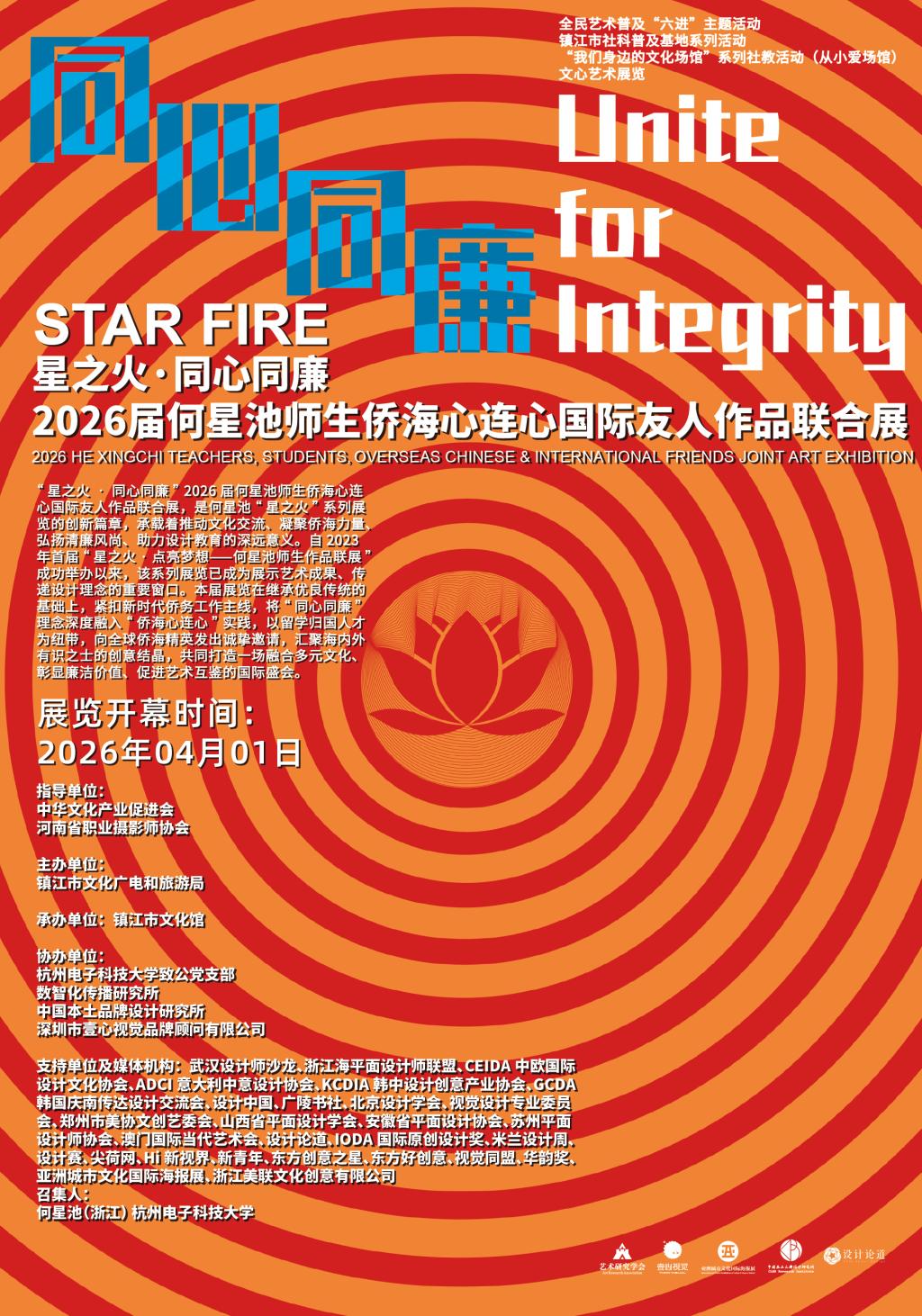 2026年4月1日,备受瞩目的“星之火·同心同廉”——2026届何星池师生侨海心连心国际友人作品联合展在镇江市文化馆正式拉开帷幕,展览将持续至月末。此次展览由镇江市文化广电和旅游局主办,镇江市文化馆承办,杭州电子科技大学致公党支部、数智化传播研究所、中国本土品牌设计研究所、深圳市壹心视觉品牌顾问有限公司等单位协办。
