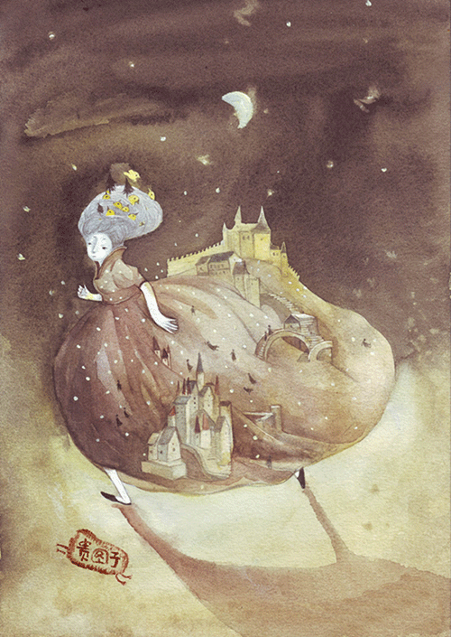 每个仙女都有一条漂亮的裙子,大大的裙摆,裙摆上有建筑,有植被,有流水……她们的工作是一路唱歌一路旋转着跳舞,吸引沿途的人们住到她们的裙子上来。