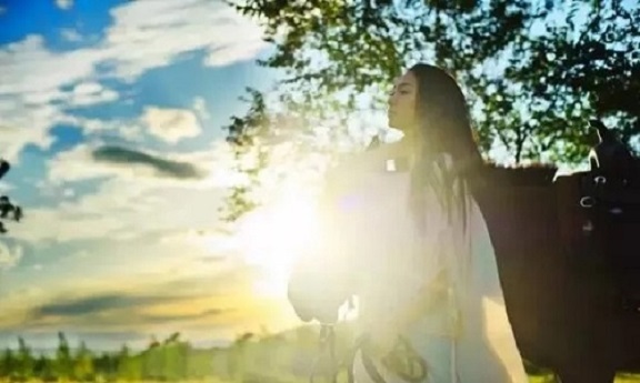 直射光属于硬光,容易在人物脸上形成阴影·。在特殊类型的人像中,阴影能创造特定氛围,但在大多数情况下还是要尽量减少阴影。最简单的办法就是,让人物调整脸部朝向,正面对着光源,这样无论是多,多强的光线,在脸上都不会形成阴影。如下图所示,光线从斜上方来,那就让人物抬起脸,使入射光线形成正面光,这样至少在脸部不会出现阴影: