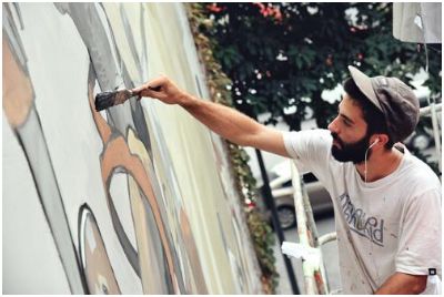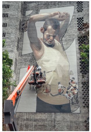 为了完成这幅总面积高达240平米的巨型墙绘,Aryz耗时一周,使用了23桶立邦涂料。在这幅巨大的墙绘中央描绘了一名身着背心的健硕男子,他的四周围绕着很多孩子和女人,他们或捧书阅读,或投入工作,或挥舞手臂……无数个跃动的形象组成出一个人的成长图谱。当谈及其作品的内涵时,Arzy说:“这幅墙绘反映了人们从婴儿逐渐长大,并不断追逐自己的人生目标,最终变成为一个令人敬佩的男人,而在实现这一目标之前,我们需要不停的汲取知识、修炼情操、锻炼体魄、增长眼界,这将是一个漫长的过程。”