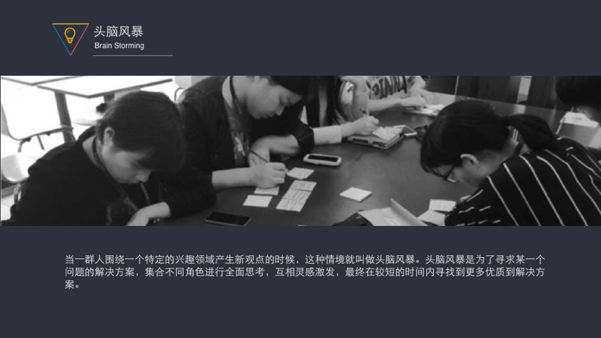 其实头脑风暴是“当一群人围绕一个特定的兴趣领域产生新观点的时候,这种情境就叫做头脑风暴”,而目的是“为了寻求某一个问题的解决方案,集合不同角色进行全面思考,互相灵感激发,最终在较短的时间内寻找到更多优质到解决方案。”