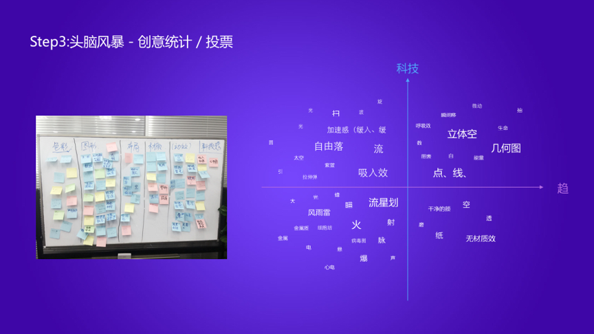 它的整体过程也是严格按照头脑风暴的各个流程进行创意的搜集,陈述,投票和方案创造。大家看到左边的这个图,就是它根据需要优化的各个部分,色彩,图形,布局,材质等等,大家进行相应元素的搜集和投票。