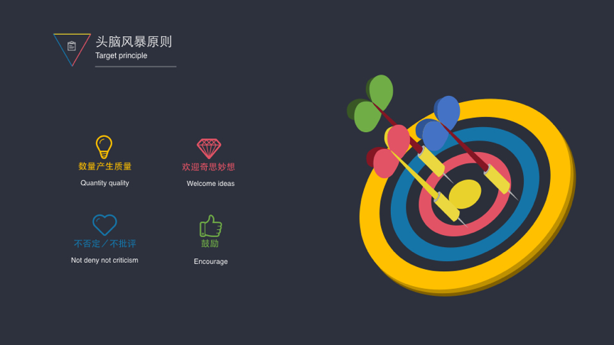 最后我们再次强调一下鼓励原则。鼓励天马行空,鼓励奇思妙想,鼓励数量多多,不批评,不能否定,这是我们的原则。