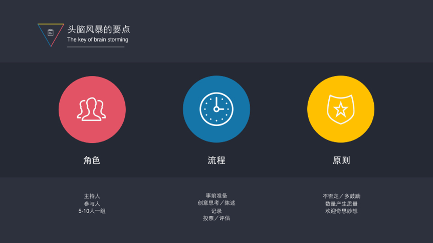 头脑风暴首先大家需要了解最主要的三个元素。第一,角色。一般多少人进行最好呢,5-10人,人多会打架,也拖慢进度,对于思考的节奏不好。第二,头脑风暴需要提前进行准备,按照一定的流程来进行,要求主持人和参与人对于头脑风暴需要达成的目的要有清晰的认识。第三呢,还有不否定、多鼓励、数量产生质量、欢迎奇思妙想等很多的原则需要考虑。