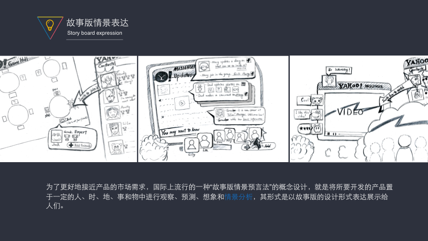 故事板的方法,也叫故事板情景预言法,就是将所要开发的产品置于一定的人、时、地、事和物中进行观察、预测、想象和情景分析,其形式是以故事版的形式表达展示给人们。在整个故事板的表达中,人,时,地,事,物的表达是关键,总结起来就是先要明确产品的特色是什么,什么样的人会来使用,在什么环境下,什么时间来使用,使用时的界面要素是什么,人使用后会有什么样的情绪反馈和结果达成。