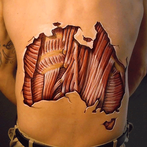 Danny Quirk从女朋友万圣节搞怪面具中得到灵感,利用液态乳胶与马克笔进行创作,绘制了人体肌肉和韧带组织。 Quirk用液态乳胶在模特们的身体部位上作画,看上去就像是身体的窗口,展示了此刻身体的运作,逼真又有趣!