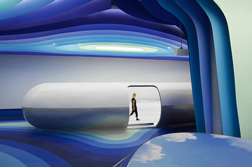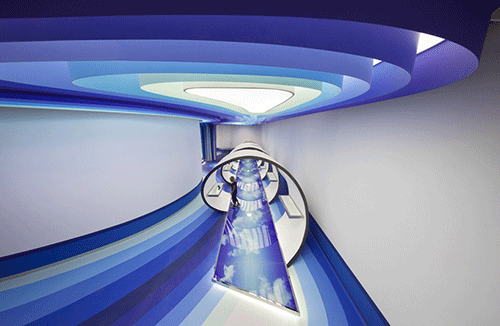 地面的艺术品突出了天空中行走的主题,在螺旋形的尽头有一个交互式屏幕