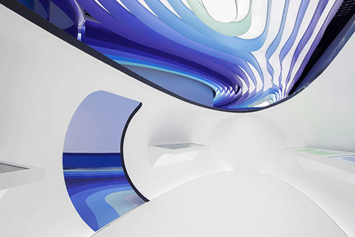 考虑到公司的名称,云DCS,该项目的主题就是关于一系列云的形象。由风塑造的云的流动性和动态性通过30米长的雕塑般的吊顶表达出来,通过空间体现了数字通信并且突出了它无形而强大的属性。该吊顶由金属制成并着七种渐变的蓝色,覆盖了法国巴力的弹力布,采用了背照式霓虹灯。与吊顶这种纯净的艺术品相同,地板上将巨大的绘画印刷在树脂面层上,创造出行走在天空的感觉。