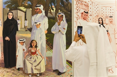 刘小东《Hamad bin Abdulaziz Al-Kuwari阁下一家》(展览现场)。