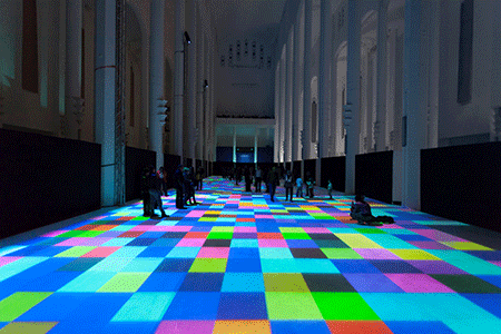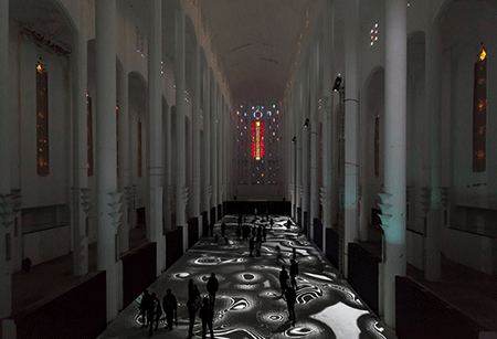 这个创意灵感源于一种视觉艺术风格——伊斯兰艺术,当游客走在其中,交互设计让虚拟地毯的色彩位置不断变化,同时四周传来 Michel Redolfi 的音乐回响,使游客与周遭的环境空间形成「对话」,绚丽生动。(图/花瓣网创意达人「豆豆」教堂画板)